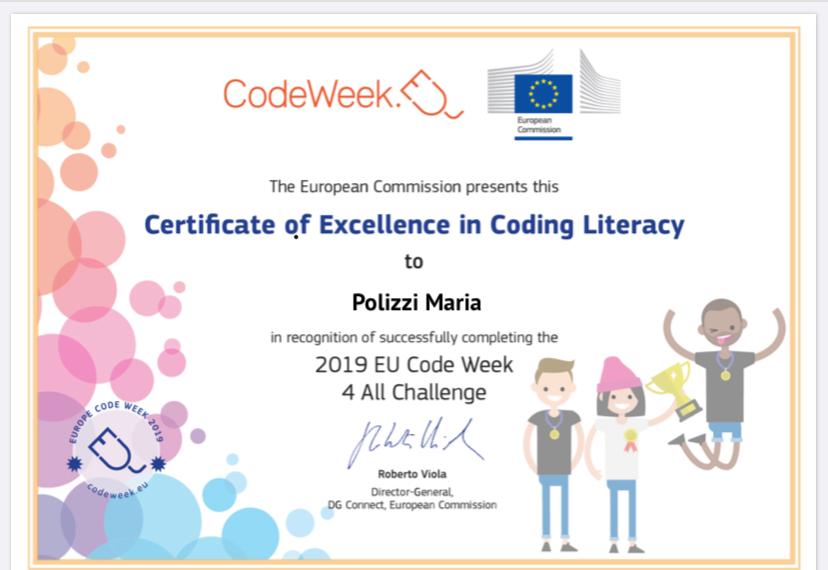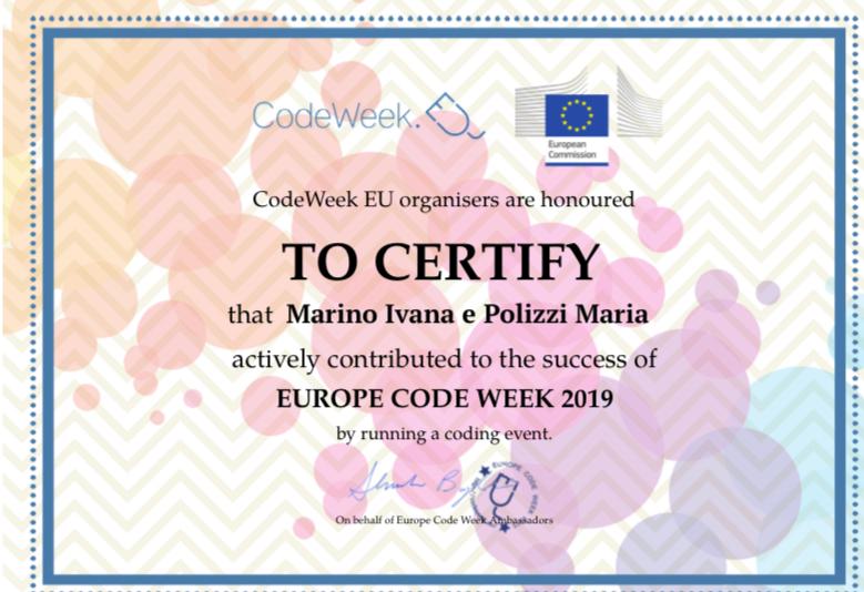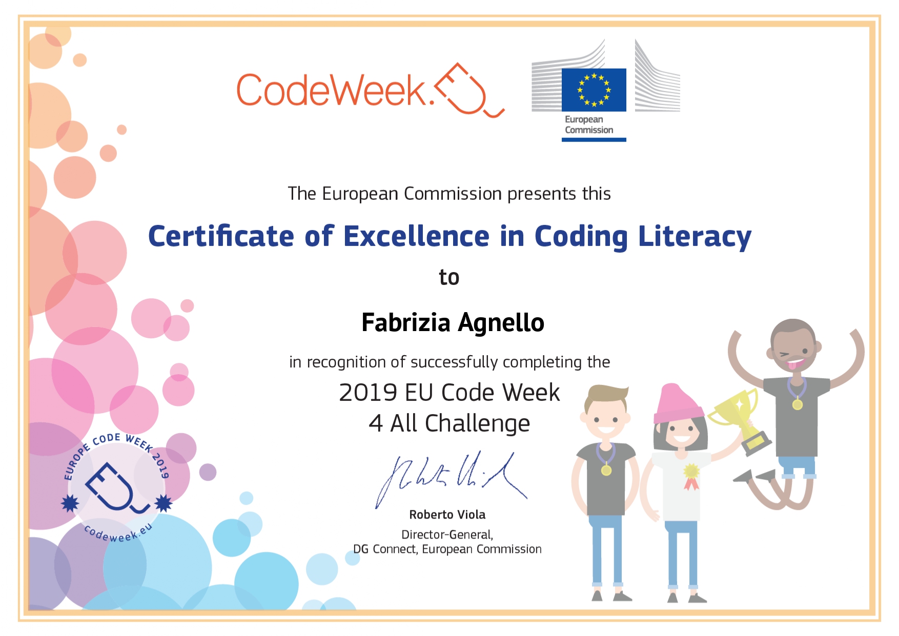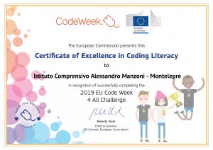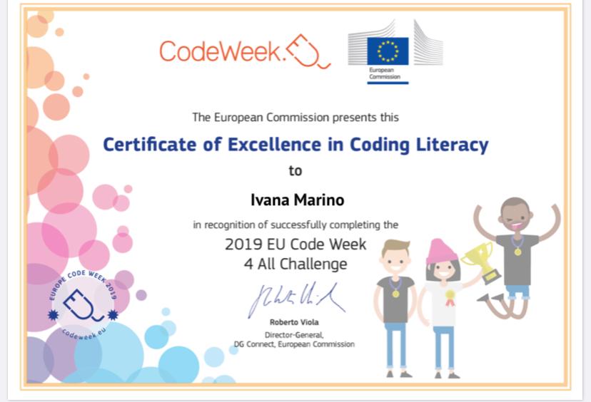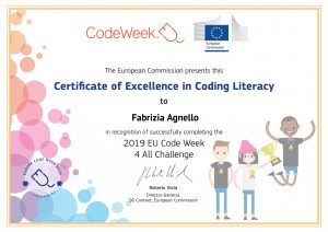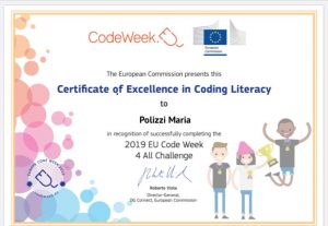 Nell’ambito del progetto Erasmus + ” WORKING TOGETHER: EDUCATION THROUGH NEW BRIDGES – Trabajando juntos: education a traves de nuevos puentes” 2019-1-ES01-KA229- 065886_3 e dell’omonimo progetto eTwinning, in cui il nostro Istituto Scolastico è partner della scuola spagnola “Colegio Diocesano Nostra Santa María Nuestra Señora” e della scuola portoghese “Escola Secundária Dr. Joaquim Gomes Ferreira Alves”, le nostre insegnati Ivana Marino, Maria Polizzi e Fabrizia Agnello hanno svolto le attività di coding cui sopra e pertanto hanno ricevuto per loro stesse, per le Sezioni e le Classi che vi hanno preso parte, e per l’intero Istituto Scolastico, diversi riconoscimenti a livello europeo in merito ai quali si pubblicano di seguito i Certificati.